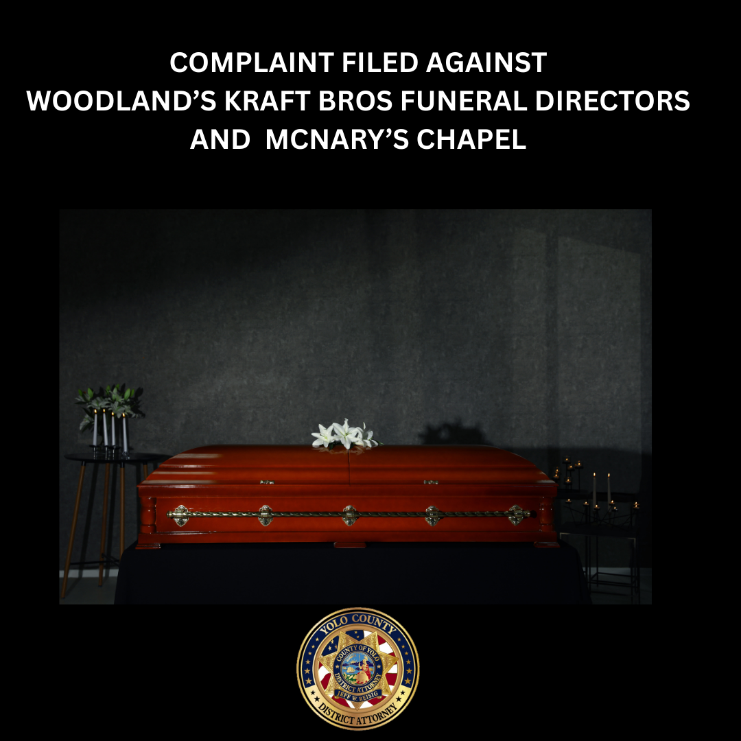 Woodland, CA – September 3, 2025 – On August 29, 2025, a civil enforcement action was filed by the Yolo County District Attorney’s Consumer Fraud Division against Kraft Brothers Funeral Directors and McNary’s Chapel, and their owners Paul and Lailene Wiggins. The civil complaint alleges Defendants overcharged nearly every family who entrusted Kraft or McNary’s with the final arrangements for their deceased loved ones. The complaint also alleges Defendants engaged in routine misconduct in the sale and administration of preneed insurance, which individuals can purchase so their future funeral expenses are pre-paid.