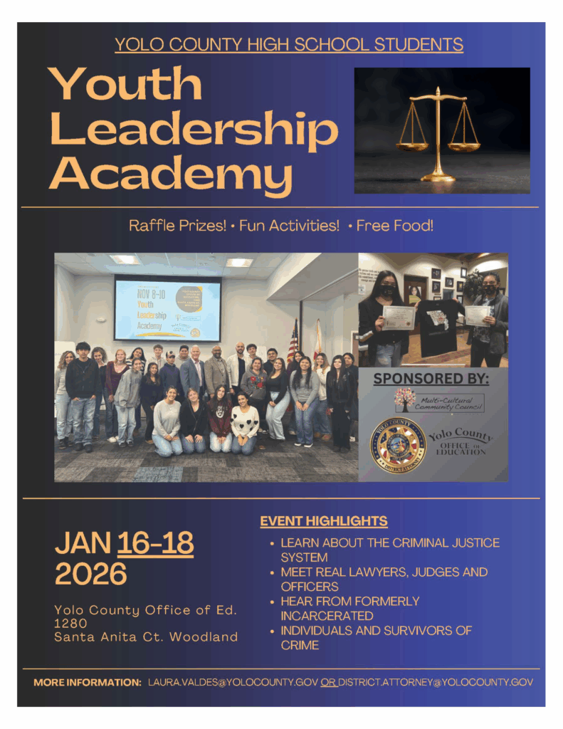 The Yolo County Multi-Cultural Community Council partnered with the District Attorney’s Office and local law enforcement to create a Youth Leadership Academy. At the Youth Leadership Academy, high school students actively learn about the criminal justice system, discuss concepts of social and procedural justice, and engage in open dialogue between law enforcement and themselves concerning issues that affect the community. The Academy was designed with the goal of promoting acceptance, engagement, and leadership with youth in Yolo County communities.