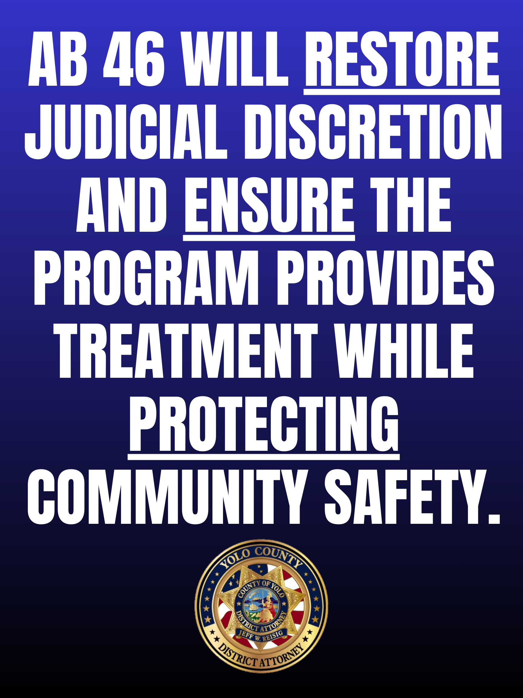 WOODLAND, CA — The Yolo County District Attorney’s Office is joining the California District Attorneys Association in their statewide call for the California Legislature to pass common sense mental health diversion (MHD) legislation, Assembly Bill 46. This legislation is sponsored by the Sacramento County District Attorney’s Office and co-sponsored by many district attorneys’ Offices across the state, including the Yolo County District Attorney’s Office. This bill closes legal loopholes in California’s mental health diversion law by restoring judicial discretion and ensuring the program provides treatment while protecting community safety.